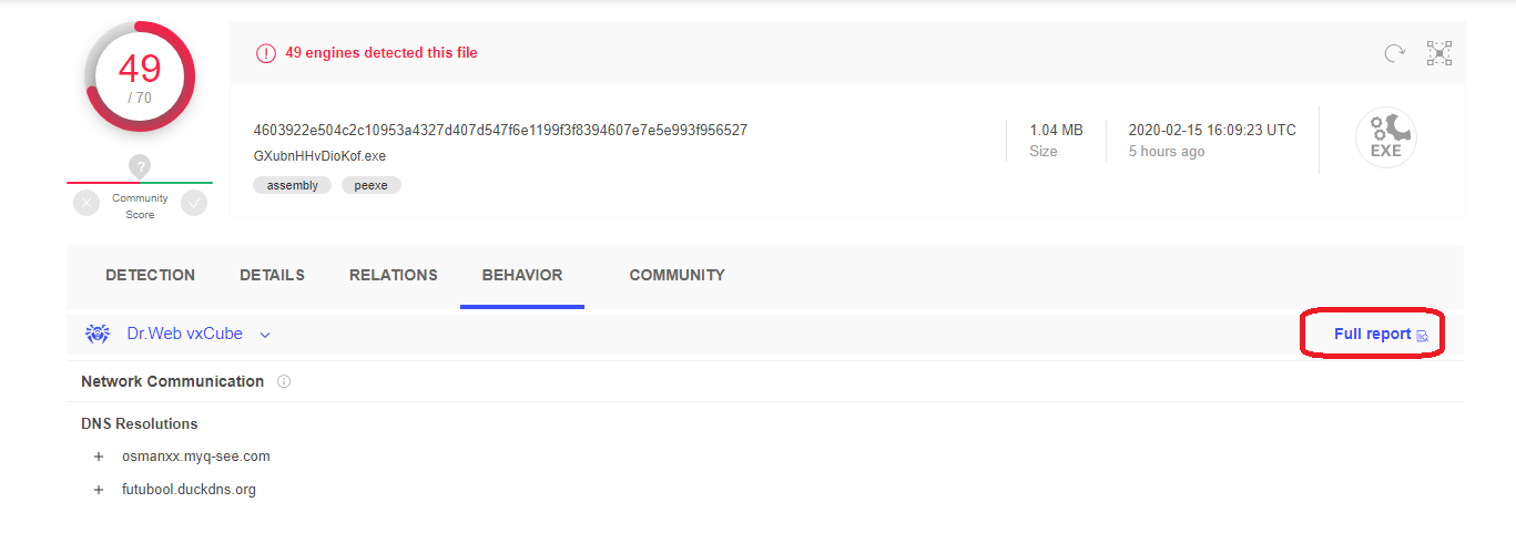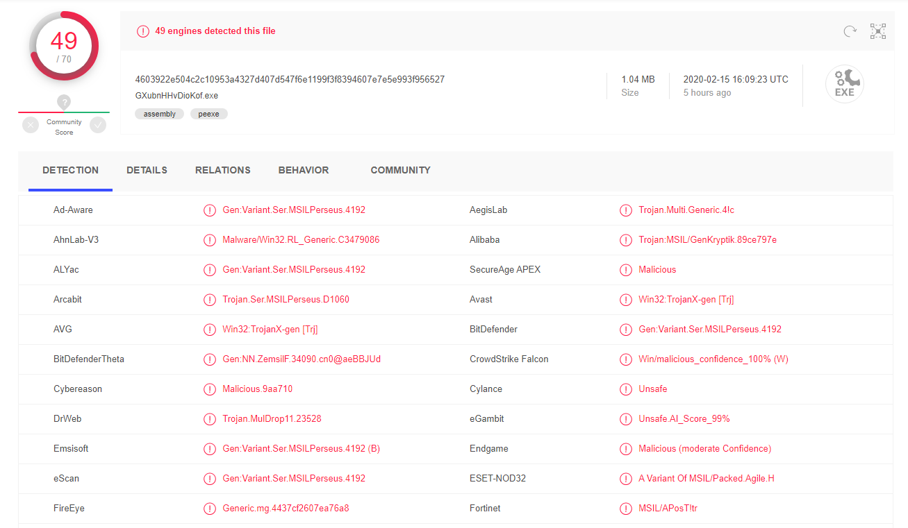DETAILS, RELATIONS, BEHAVIOR, COMMUNITY 탭을 통해 악성 파일의 자세한 정보, 다른 악성코드와 연관성, 행위 등 세부적인 분석 결과를 확인할 수 있습니다.