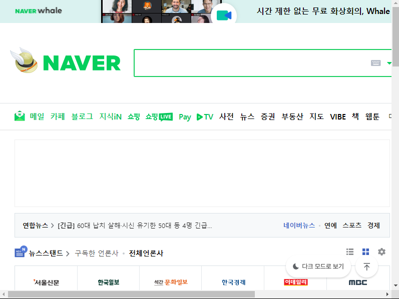 | ### URL 스크린 샷 from selenium import webdriver options = webdriver.ChromeOptions() options.add_argument('headless') driver = webdriver.Chrome(options=options) driver.get('http://www.naver.com/') driver.get_screenshot_as_file('./naver_main.png') |