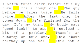 | I watch three climb before it’s my turn.[lit’s a tough one.|ilithe guy before me tries twice.[ll He falls tuice.[lAfter the last one, he cones down,lie’s finished for the gay. Te's my turn. “good luck!” to me.) pit of a problem, outcrop on this one. halfway up the wall. It's not a |